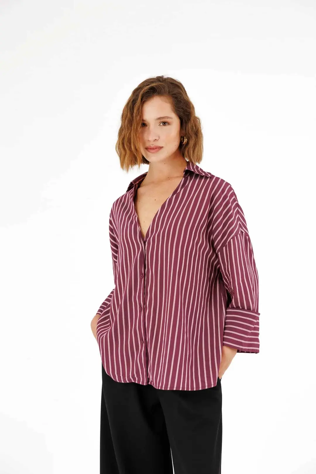 Çizgili gömlek modelleri, hem ofis kombinlerinde hem de günlük şehir stilinde kullanılabilen işlevsel bir temel parçadır. Deseniyle sade parçaları hareketlendirir, katmanlı kullanımda alttan gelen çizgileriyle kombine derinlik kazandırır.